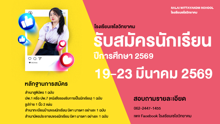 - ประกาศโรงเรียนเซไลวิทยาคม เรื่อง แจ้งการจัดการเรียนรู้แบบผสมผสาน (Blended - Hybrid) ในวันที่ 16 มกราคม พ.ศ. 2569 ( 15 ม.ค. 69 )
